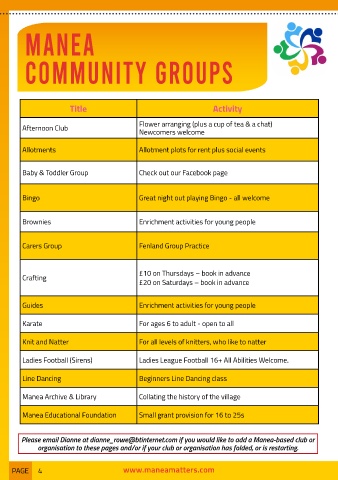 Please email Dianne at dianne_rowe@btinternet.com if you would like to add a Manea-based club or
