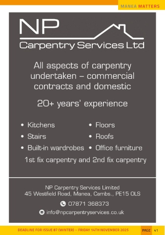 DEADLINE FOR ISSUE 87 (WINTER) – FRIDAY 14TH NOVEMBER 2025 PAGE 41